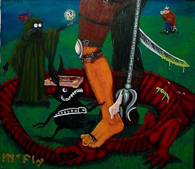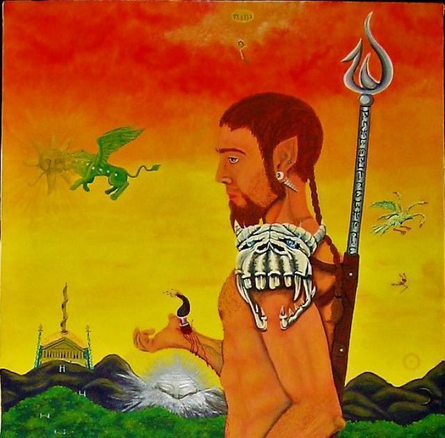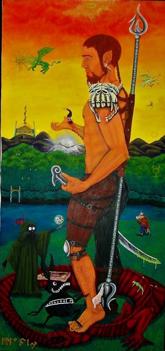 Auto retrato. Atravesando las puertas de la percepción, Autoretrato de acrílico sobre lienzo 179cm x 70 cm. 2007Esta pintura es la continuación del “Viaje astral” (la primera edición). Acá hay un mejor manejo a nivel técnico en los personajes y el simbolismo de la gnosis. Este trabajo fue dañado por un enemigo de la fé.