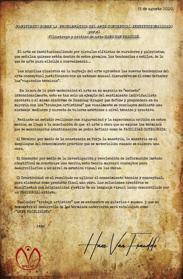 En la era de la post-modernidad el arte en su mayoría es “escueto” intencionalmente un ejemplo del sentimiento individualista snobista de esta sociedad. Los trabajos son una síntesis mediocre y carente de valores estéticos a nivel técnico y creativo.