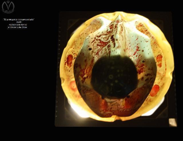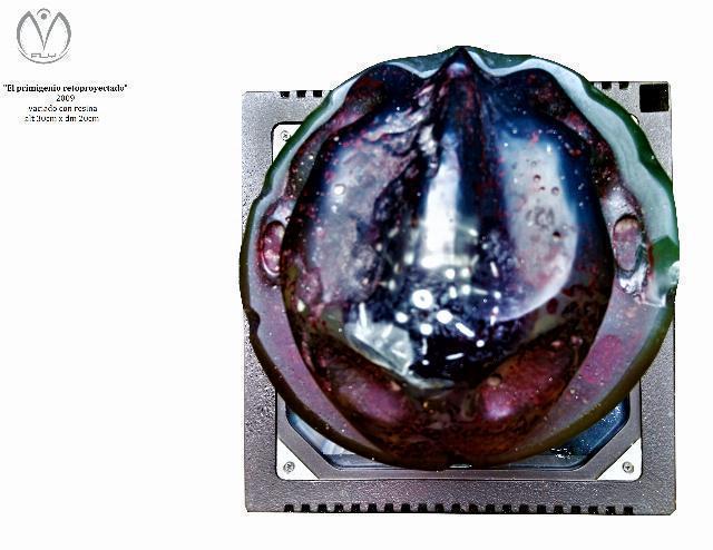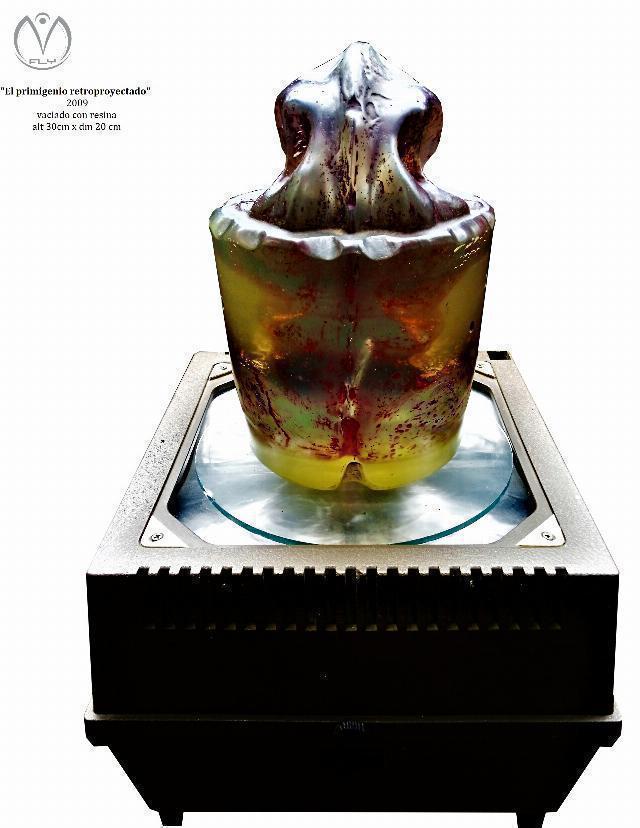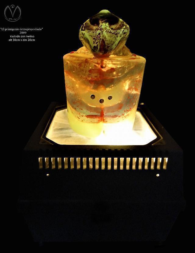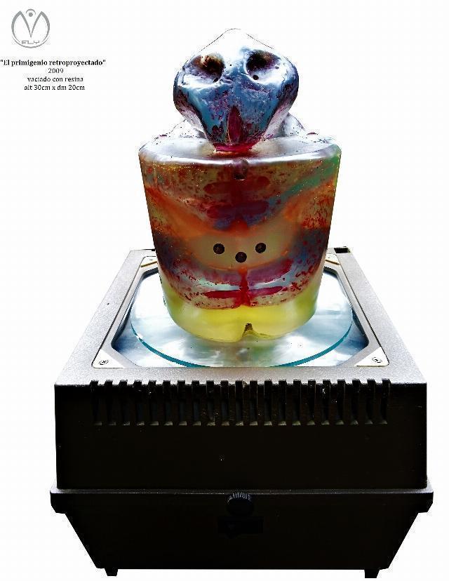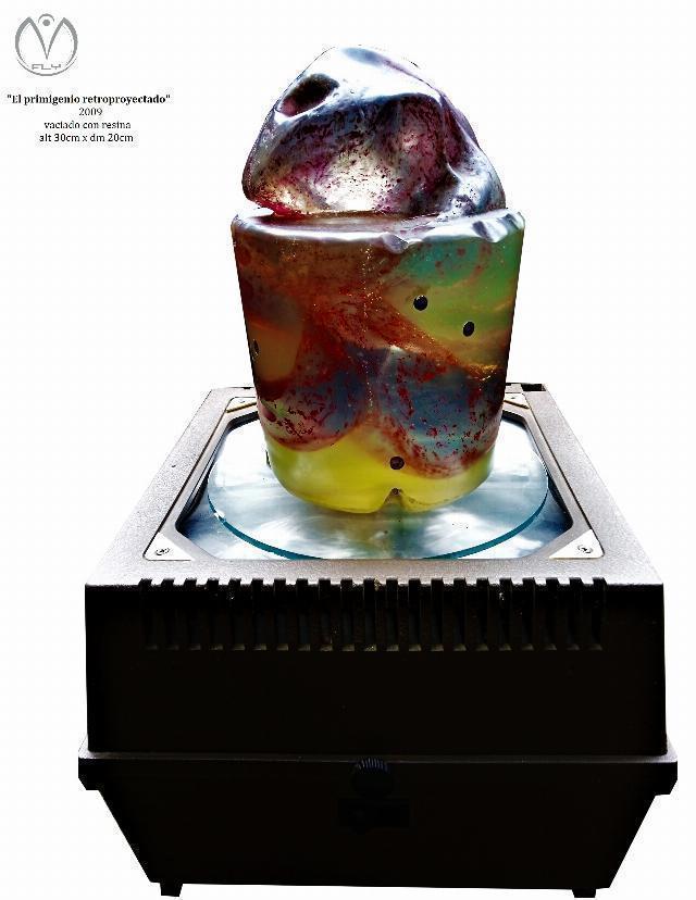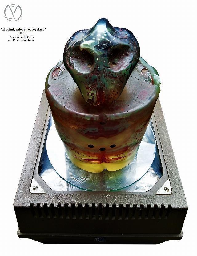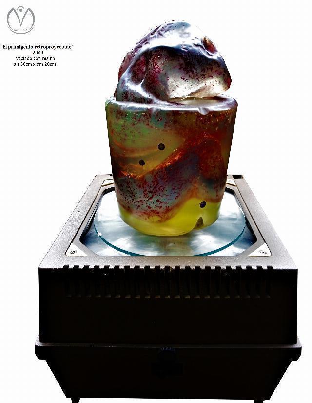 Es una escultura hecha en el año 2009, a partir de un complejo proceso de vaciado en un molde con resina. 27cm altura x 18cm diámetro y su pedestal es un retro proyector modelo 15000, es funcional porque actúa como una lámpara.