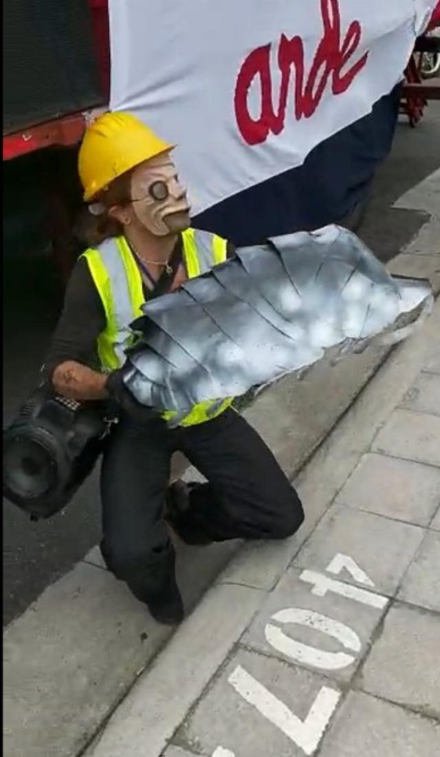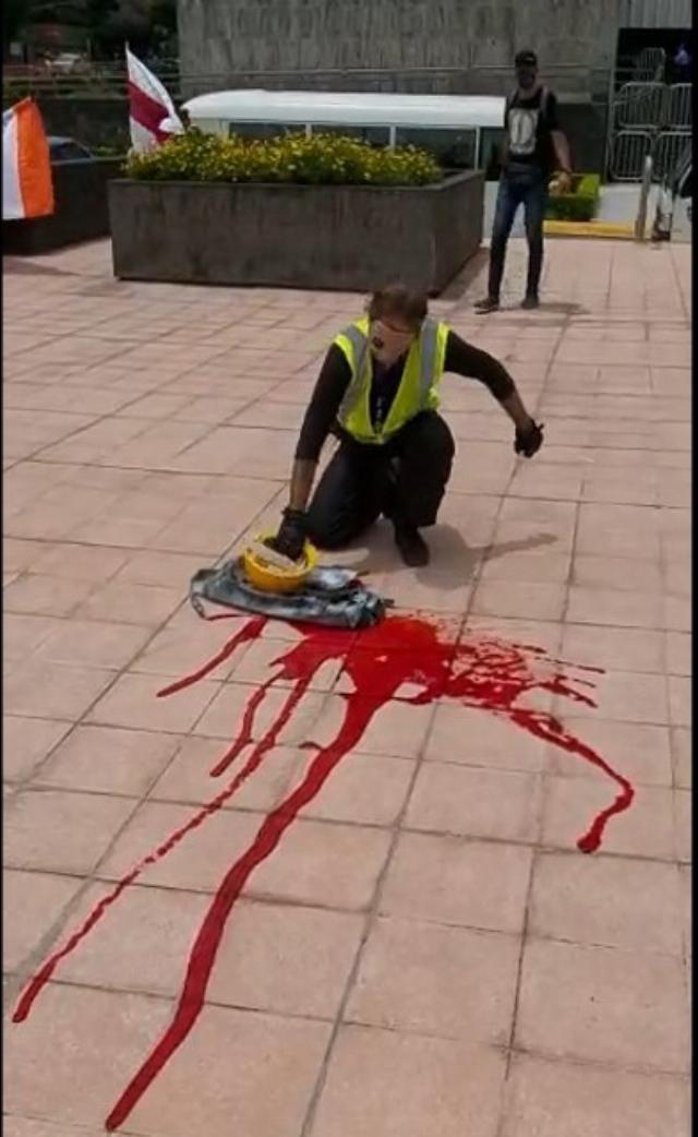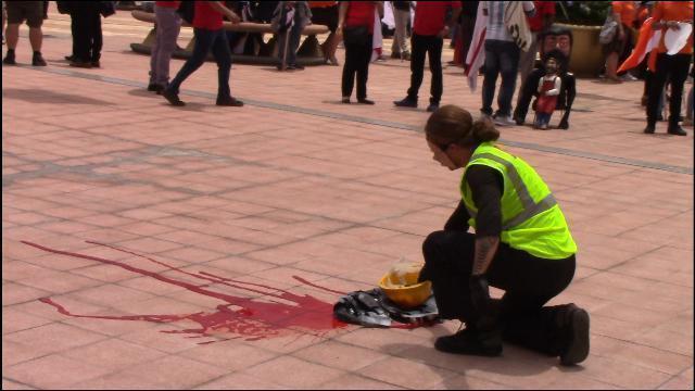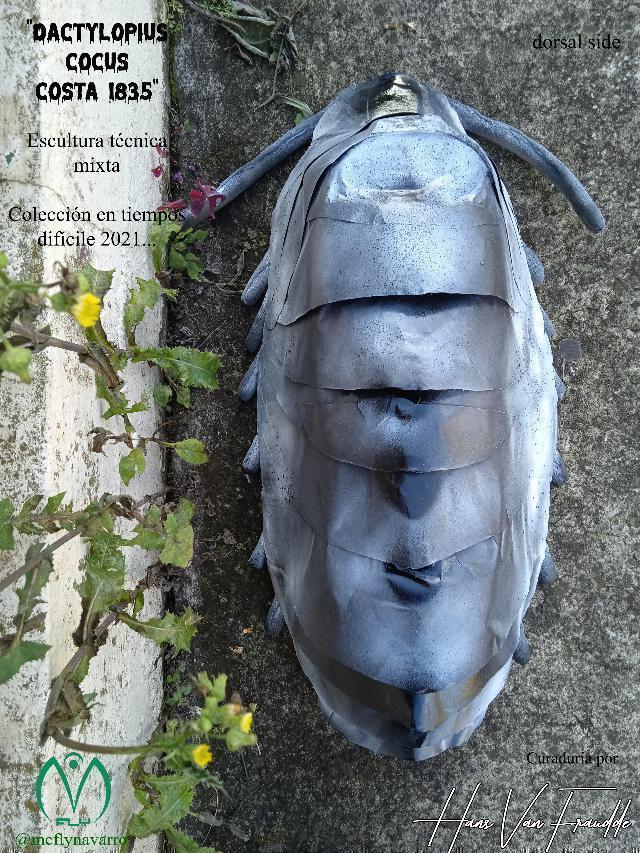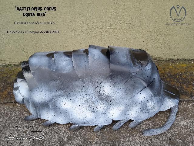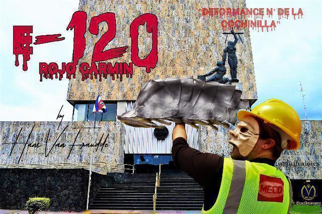 De la cochinilla se obtiene el tinte E-120 rojo carmín que se utiliza en la industria de textiles. Esta obra es una simulación de una cochinilla en cartón y adentro se le colocó una gran capsula con el tinte rojo carmín, simulando una piñata de modo que después de tantos golpes esta reviente y expulse el líquido rojo (sangre).